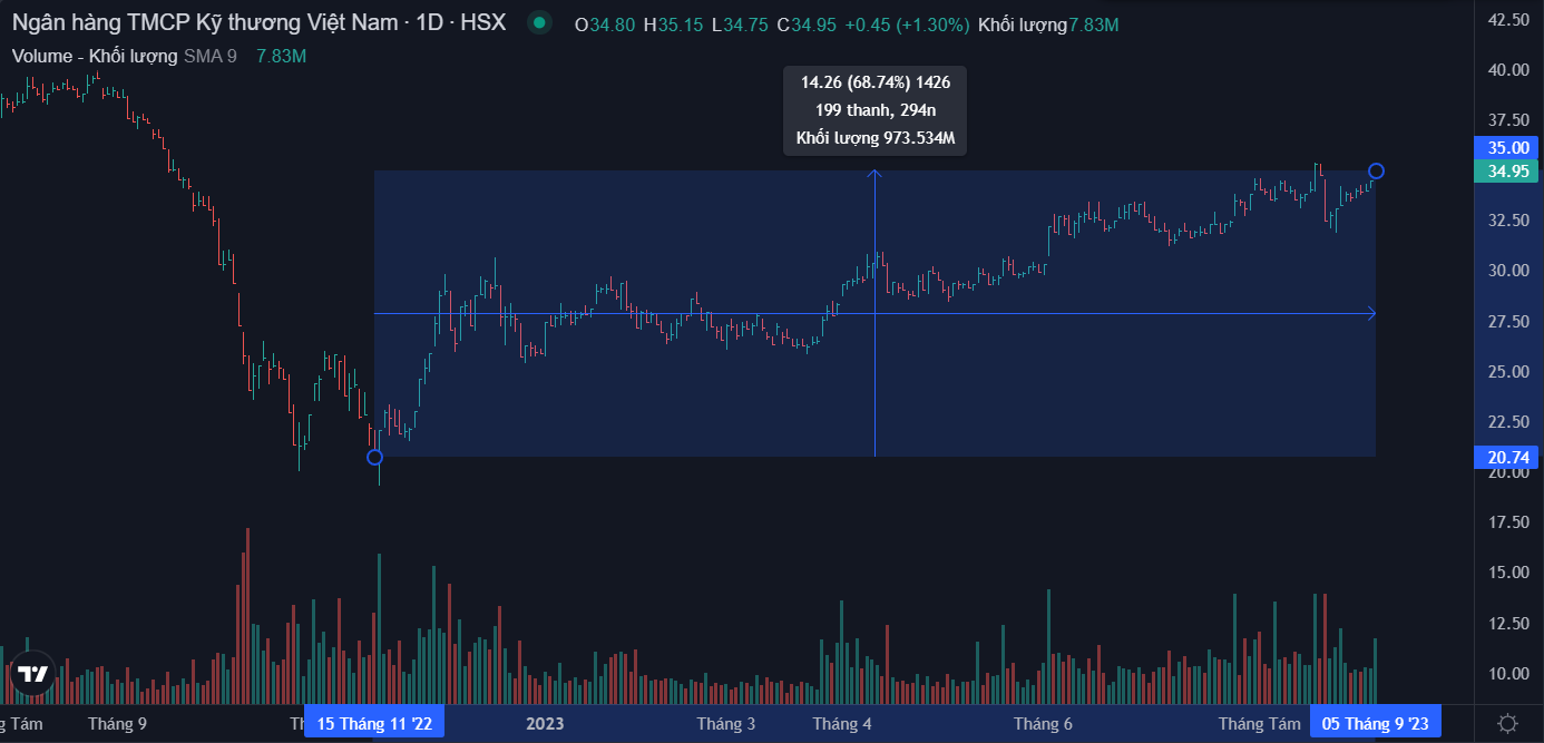 … giá cổ phiếu TCB tăng 68.74% trong vòng 294 ngày, từ 15/11/2022 đến 05/09/2023.