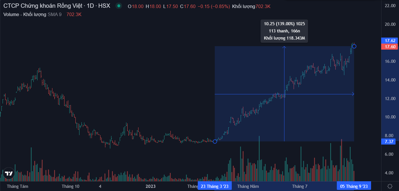 … giá cổ phiếu VDS tăng 139% trong vòng 166 ngày, từ 23/03/2023 đến 05/09/2023.