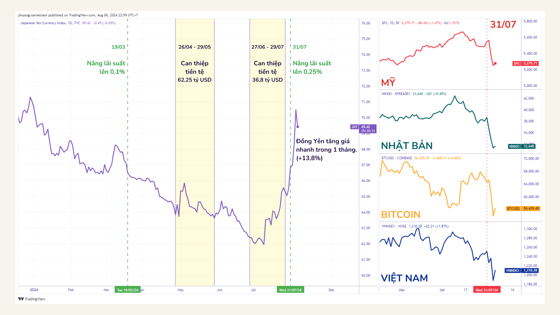 Khởi đầu tháng 08/2024, các thị trường tài chính toàn cầu như crypto, vàng, bạc, dầu, thị trường cổ phiếu (Mỹ, Châu Âu, Nhật Bản, Hàn Quốc, và cả… Việt Nam) đã có những phiên giao dịch tắm máu, giảm mạnh với những thanh nến đỏ dài xuyên thẳng vào trái tim của nhà đầu tư.