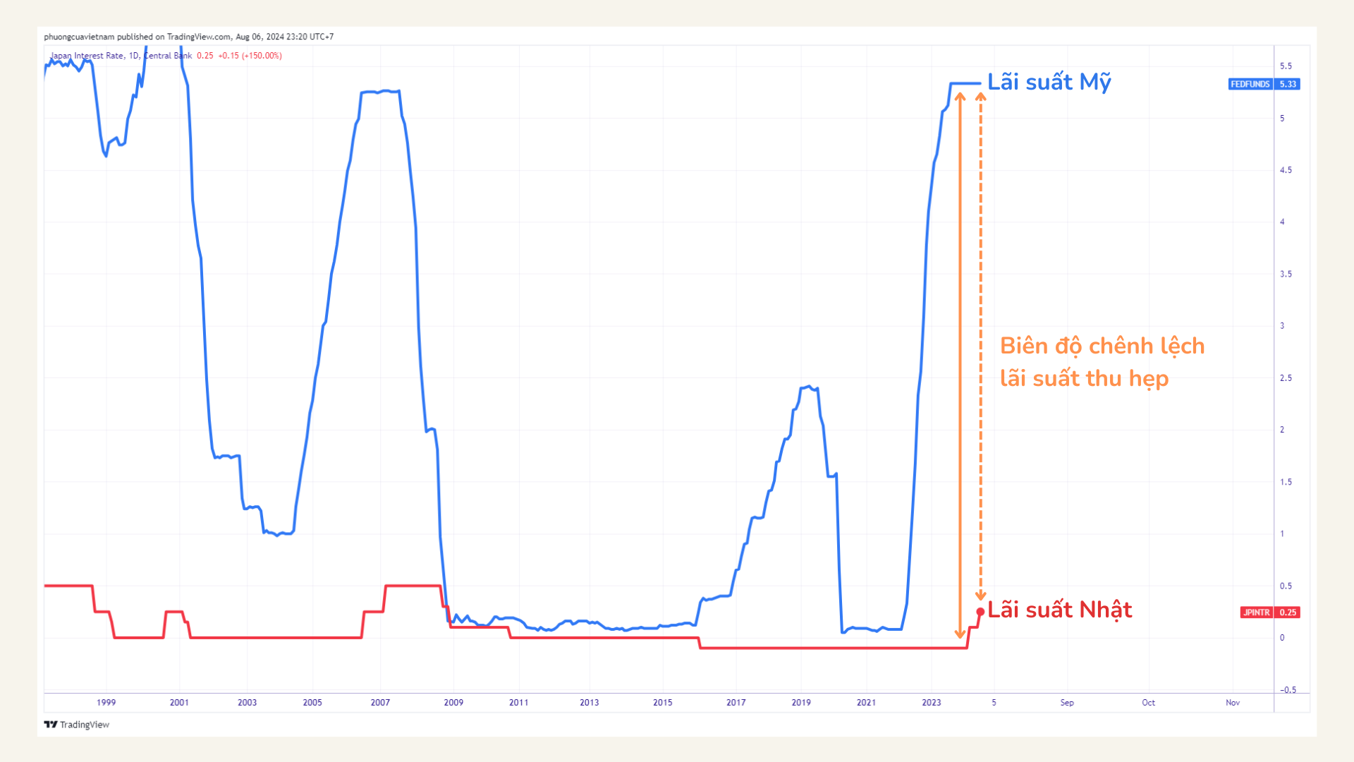 Ngày 31/07/2024, BOJ tăng lãi suất lên 0,25%. Đây là mức lãi suất cao nhất của Nhật Bản kể từ đợt khủng hoảng tài chính toàn cầu vào năm 2008. Đồng thời, thống đốc Kazuo Ueda cũng thể hiện quan điểm tiếp tục thắt chặt tiền tệ trong tương lai.
