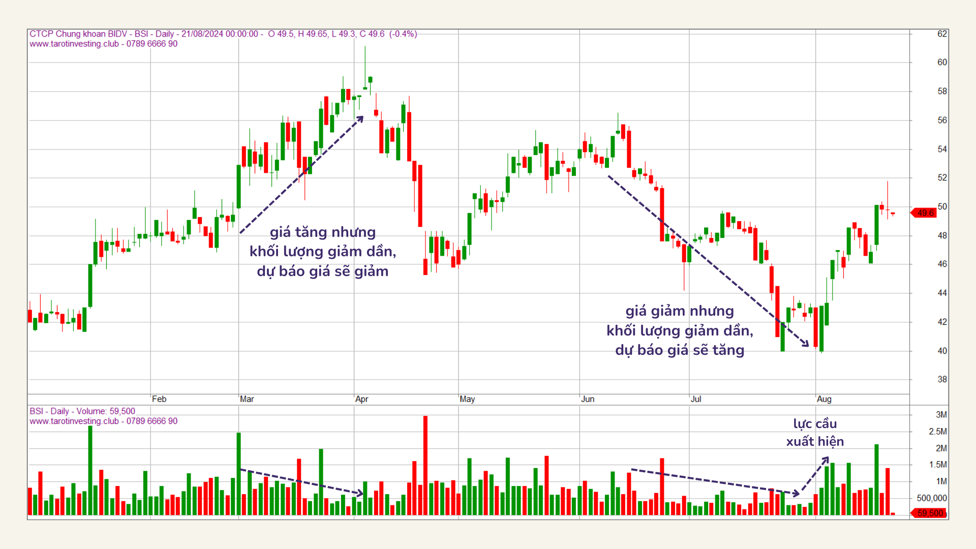 Tính dự báo của cung cầu sẽ giúp nhà đầu tư hành động được sớm hơn, đồng thời cũng chấp nhận rủi ro nhiều hơn. Khi giá tăng lên mà khối lượng giảm dần, cho thấy cầu yếu đi, thì bạn có thể bán bớt cổ phiếu để giữ lấy một phần lợi nhuận. Tất nhiên phải chấp nhận việc giá sẽ tăng tiếp tục chứ không đảo chiều giảm xuống. Ngược lại, khi giá đã giảm một thời gian và khối lượng cũng thấp dần thì bạn có thể cân nhắc mua một ít cổ phiếu để có lợi thế giá thấp khi cạn cung. Nếu sau đó giá đi ngang hoặc giảm tiếp tục thì phải chấp nhận cắt lỗ.