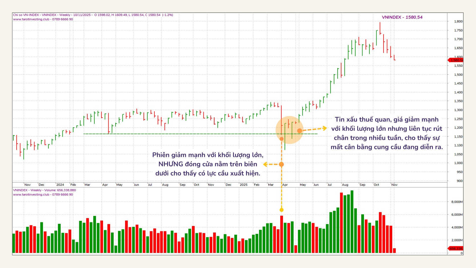 Tình huống 1: vào đầu tháng 04/2025, VNINDEX có hai tuần giảm mạnh với khối lượng giao dịch lớn. Tuy nhiên, giá đóng cửa của hai tuần đều nằm trên đường biên hỗ trợ. Điều này cho thấy “sự bất thường” trong cung cầu đang diễn ra, cơ hội dần hé lộ. Thanh giá giảm dài nhưng rút chân mạnh cho thấy lực cầu đỡ giá và có người đang âm thầm mua vào trong sự hoảng loạn của đám đông. Lực cầu dần kiểm soát cuộc chơi mặc dù giá chưa tăng mạnh.