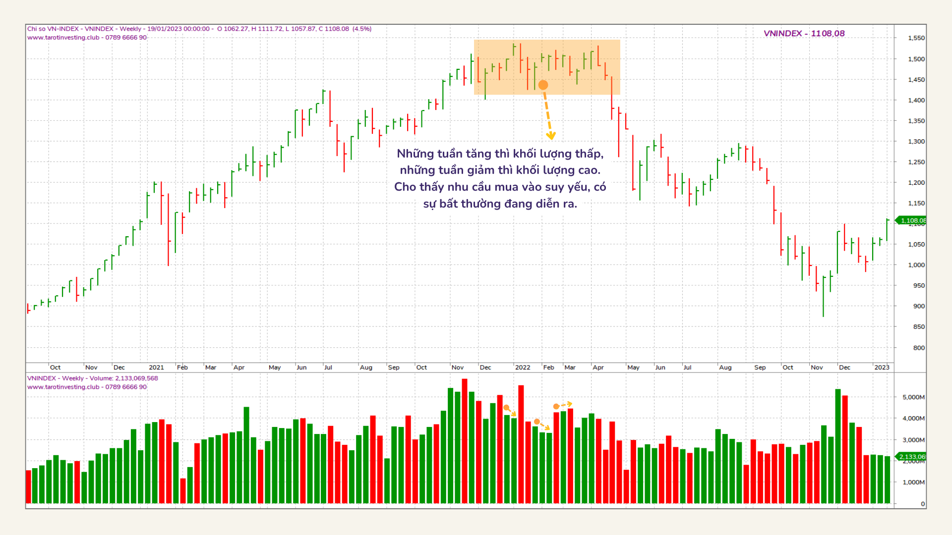 Tình huống 2: bắt đầu từ tháng 12/2021 đến cuối tháng 03/2022, VNINDEX hình thành một vùng giá đi ngang. Trong đó, những tuần giá tăng lên có khối lượng giao dịch giảm dần, cho thấy lực cầu đang hụt hơi. Những tuần giá giảm xuống có khối lượng giao dịch vượt trội hơn so với những tuần tăng giá. Đây là dấu hiệu cho thấy đã có sự mất cân bằng cung cầu diễn ra, lực cung dần lấn át lực cầu. Giá chưa giảm nhưng rủi ro rình rập thị trường dần xuất hiện.